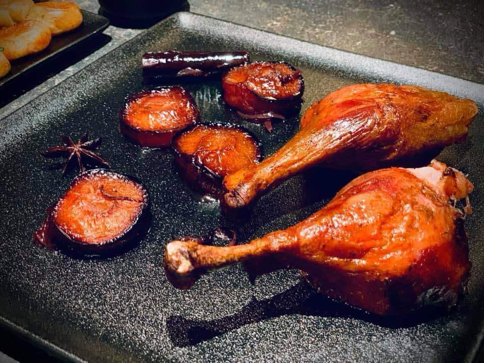 3. Put the stand into a roasting tray to catch the duck fat, and place the tray on the grill grates. Cook indirectly at 140°C for about 90 minutes. Save some of the rendered fat, as it will be used later for roasting potatoes. In a separate baking dish, combine plums, star anise, cinnamon, onion, pour in wine and stock, then place the duck on top. Continue cooking indirectly at the same temperature for another 120 minutes. With 20 minutes left, open the grill vents to increase the temperature to 200°C or higher. This will help crisp the skin beautifully. If you notice the liquid reducing too much during cooking, add some water to maintain at least one glass of sauce.