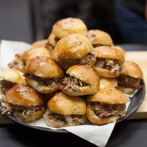 7. Toast the buns on the grill, then spread with BBQ sauce, place a lettuce leaf, the pulled pork, and the cabbage slaw. Enjoy!