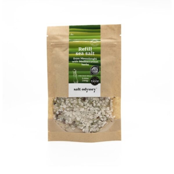 • Coarse sea salt lightly enriched with aromatic herbs.